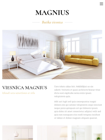 Šī šikā veidne ir lieliski piemērota Butikas viesnīcām un citām luksusa naktsmītnēm. Centrētais logo izcels zīmolu, kamēr tīrais izkārtojums ļaus viegli orientēties. Apmeklētāji var ātri atrast viesnīcas atrašanās vietu, redzēt pilnu piedāvājumu un rezervēt savu nakšņošanu.
