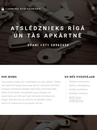 Šī veidne ir piemērota Tavam atslēdznieka veikalam. Iepazīstini ar saviem pakalpojumiem jau pašā pirmajā lapā un izcel visu svarīgāko informāciju, kā piemēram, ārkārtas pakalpojumu telefona numuru. Neaizmirsti pievienot apmierināto klientu atsauksmes, lai pierādītu, ka esi labākais atslēdznieks pilsētā.