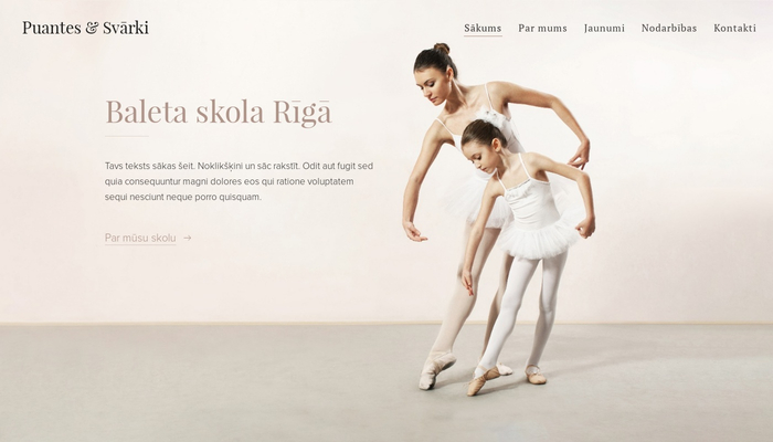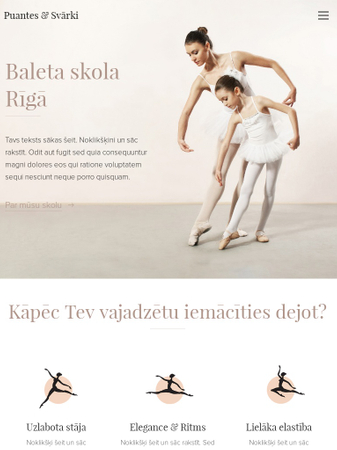 Šī elegantā veidne būs piemērota baleta skolai vai deju studijai. Tievās krāsu shēmas un attēli atbilst graciozajai deju tēmai. Savukārt saturs piedāvā visu, ko Tavi skolēni varētu meklēt. Pievieno nodarbību sarakstu, iepazīstini ar pasniedzējiem vai uzraksti bloga ierakstu par pēdējo veiksmīgo mēģinājumu. Tava deju skola būs uz pirkstgaliem!